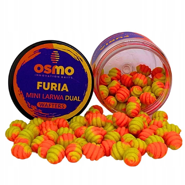 Osmo Furia jest pierwszym dualem, czyli przynętą dwukolorową w ofercie Osmo baits. Jest to kolejny wafters w charakterystycznym kształcie larwy. Przynęta krzyczy pięknymi jaskrawymi kolorami – żółtym i pomarańczowym, które są doskonale widoczne pod wodą czym doskonale przykuwają uwagę ryb. Dodatkowo furia została wyposażona w ciekawy i charakterystyczny, lekko skiśnięty zapach, który ma imitować woń pożywienia leżącego już jakiś czas na dnie zbiornika, czyli bezpiecznego dla ryby do spożycia. Połączenie kolorów i aromatów tworzy nam kolejną skuteczną i wyjątkową przynętę, którą warto mieć na swojej półce.