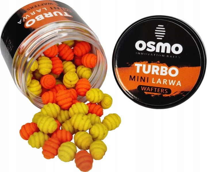 OSMO Mini Larwa Wafters to innowacyjne przynęty charakteryzują się wyjątkowym kształtem oraz małym 7mm rozmiarem. Turbo to zapach znanej gumy balonowej w kolorach żółtym i pomarańczowym.
