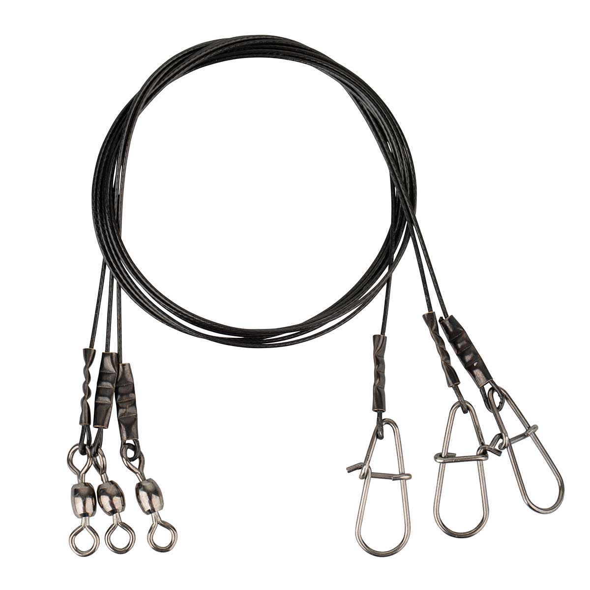 Super wytrzymałe 7 zwojowe linki stalowe, pokryte mocnym, czarnym kopolimerem, zapewniającym doskonałą odporność na przetarcie! Idealnie dobrane krętliki iagrafki ze sprężystej stali, nadają się do twardych i miękkich przynęt! Doskonałe przypony szczupakowe!